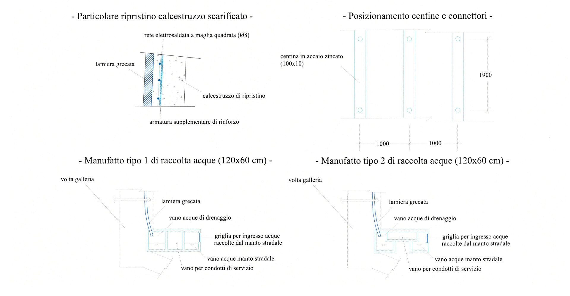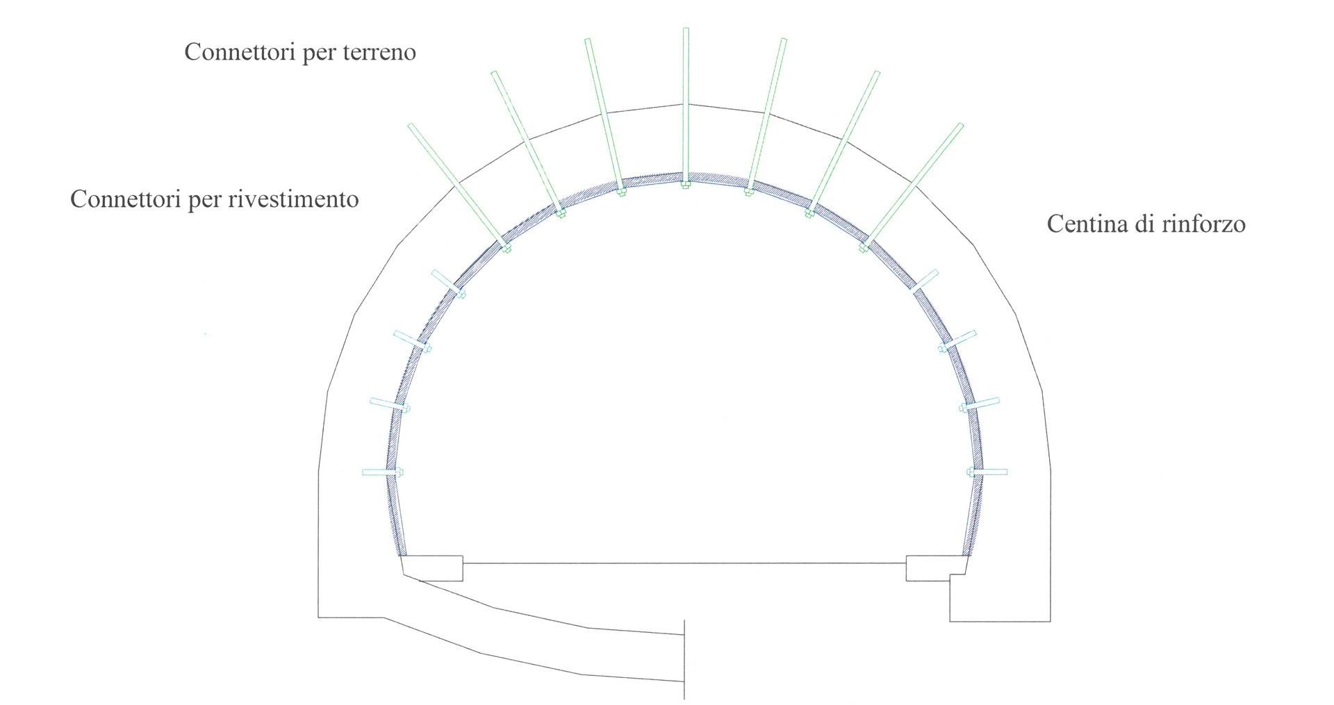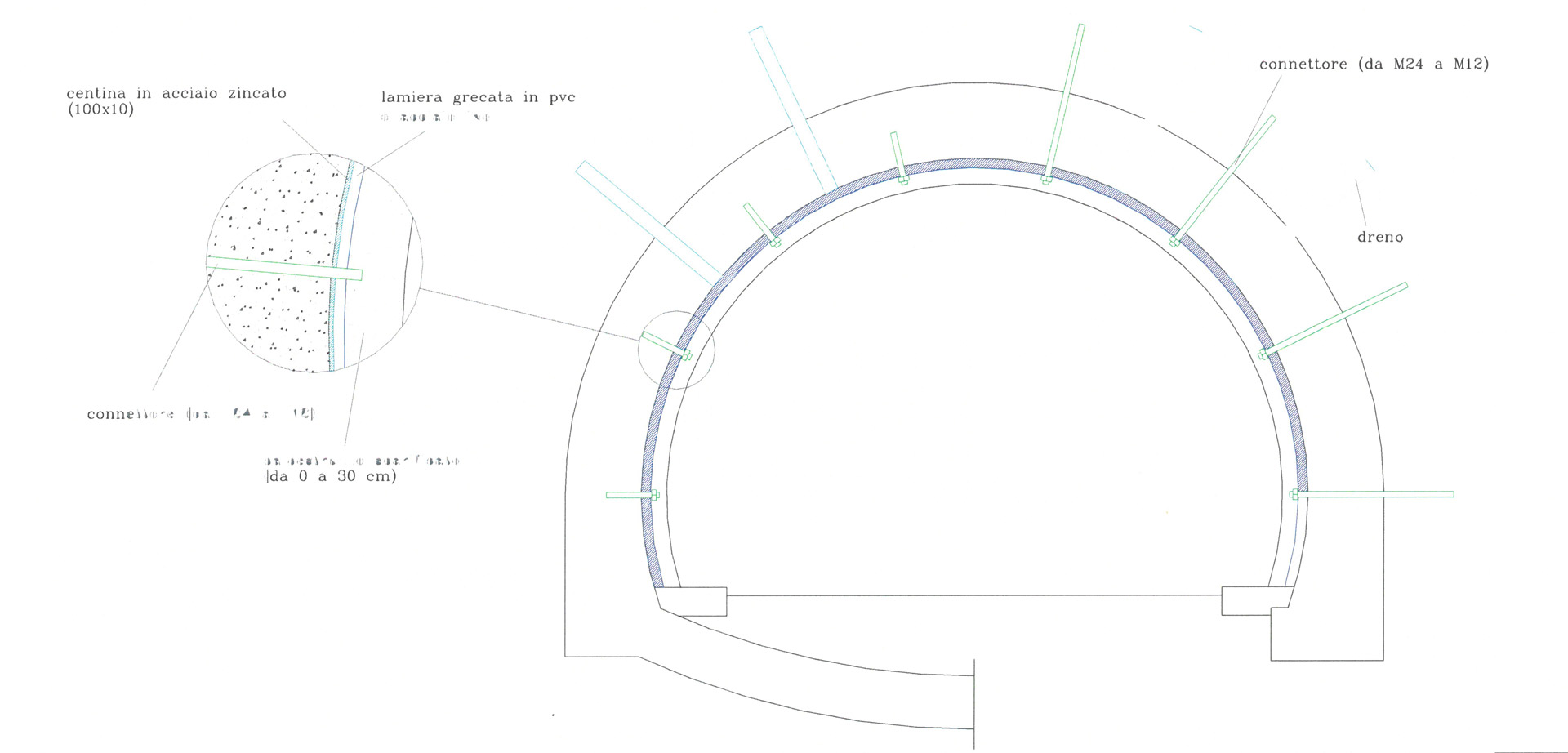 Sostituzione del manto danneggiato con posa di centine di rinforzo connesse al rivestimento esistente e al terreno circostante la volta.